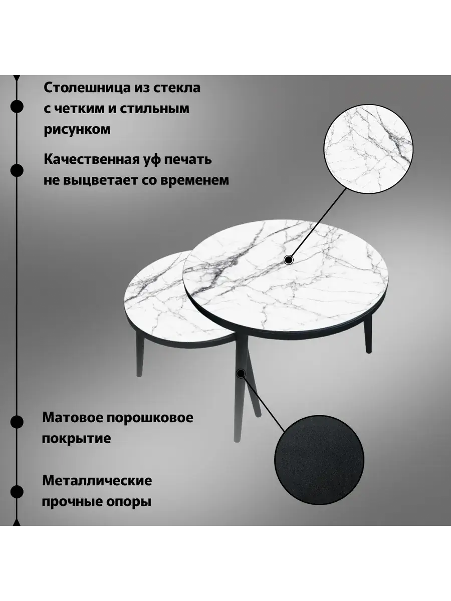Высота первого столика составляет 37 см, а диаметр — 48 см. Второй столик чуть выше — 44 см, а его диаметр равен 60 см. Вместе они образуют гармоничную композицию, которая станет прекрасным дополнением к любому интерьеру. Оба столика выполнены из качественных материалов, обеспечивающих долговечность и надёжность.
