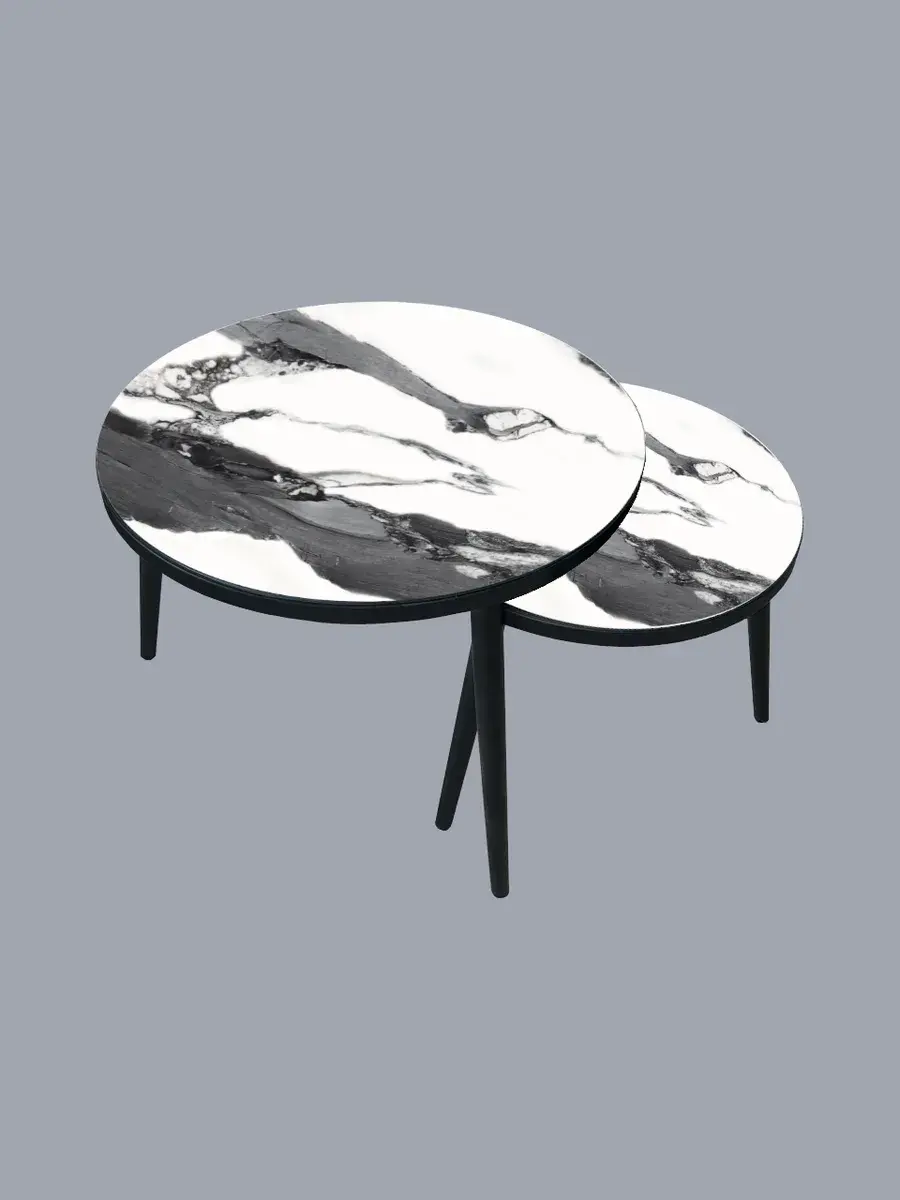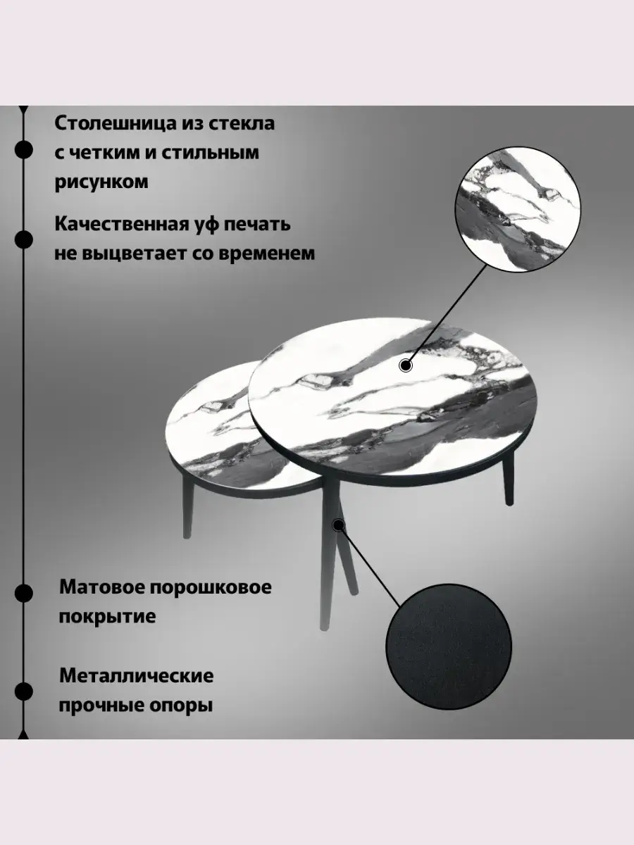Высота первого столика составляет 37 см, а диаметр — 48 см. Второй столик чуть выше — 44 см, а его диаметр равен 60 см. Вместе они образуют гармоничную композицию, которая станет прекрасным дополнением к любому интерьеру.