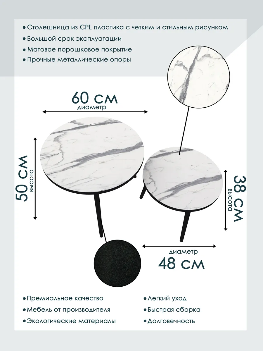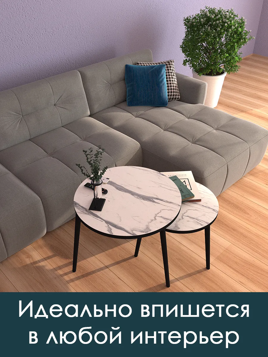 Представляем вам элегантную пару журнальных столиков, созданных для тех, кто ценит стиль и функциональность. Эти столики отличаются изысканным сочетанием чёрного цвета ножек и белых столешниц, что придаёт интерьеру особый шарм и элегантность.