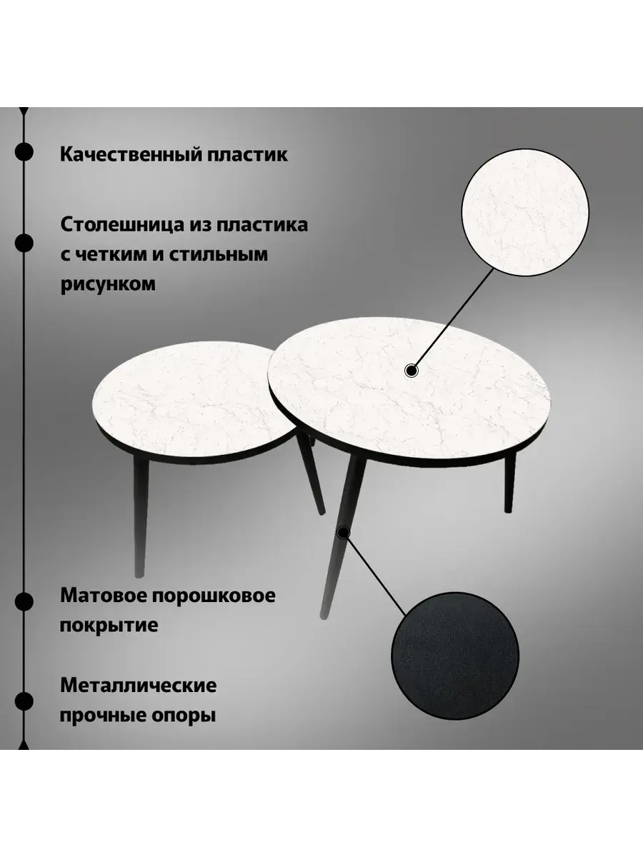 Высота первого столика составляет 37 см, а диаметр — 48 см. Второй столик чуть выше — 44 см, а его диаметр равен 60 см. Вместе они образуют гармоничную композицию, которая станет прекрасным дополнением к любому интерьеру. Оба столика выполнены из качественных материалов, обеспечивающих долговечность и надёжность.
