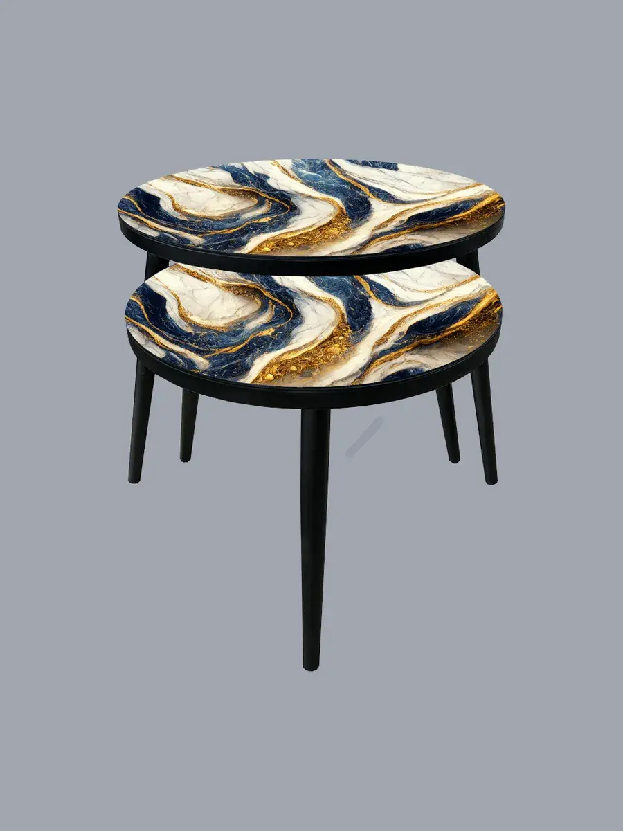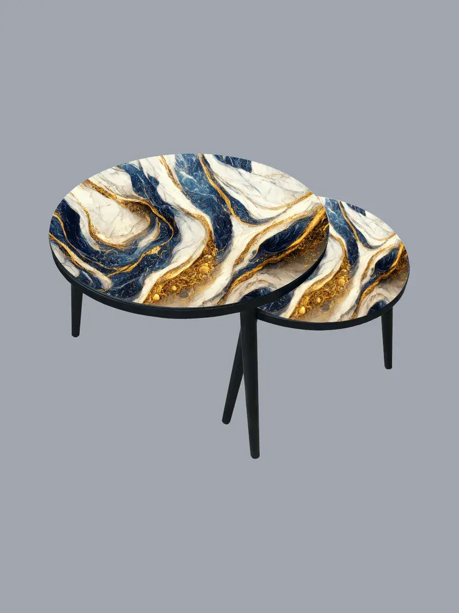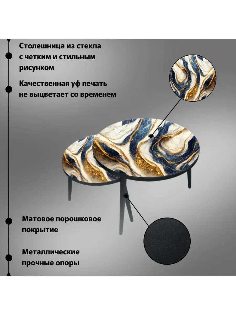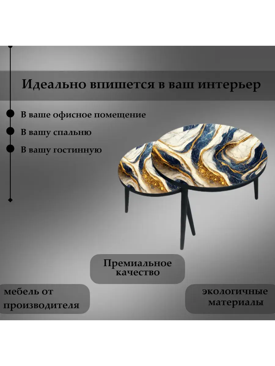Представляем вам элегантную пару журнальных столиков, созданных для тех, кто ценит стиль и функциональность. Эти столики отличаются изысканным сочетанием чёрного цвета ножек и столешниц цвета «Синее Золото», что придаёт интерьеру особый шарм и лёгкость.