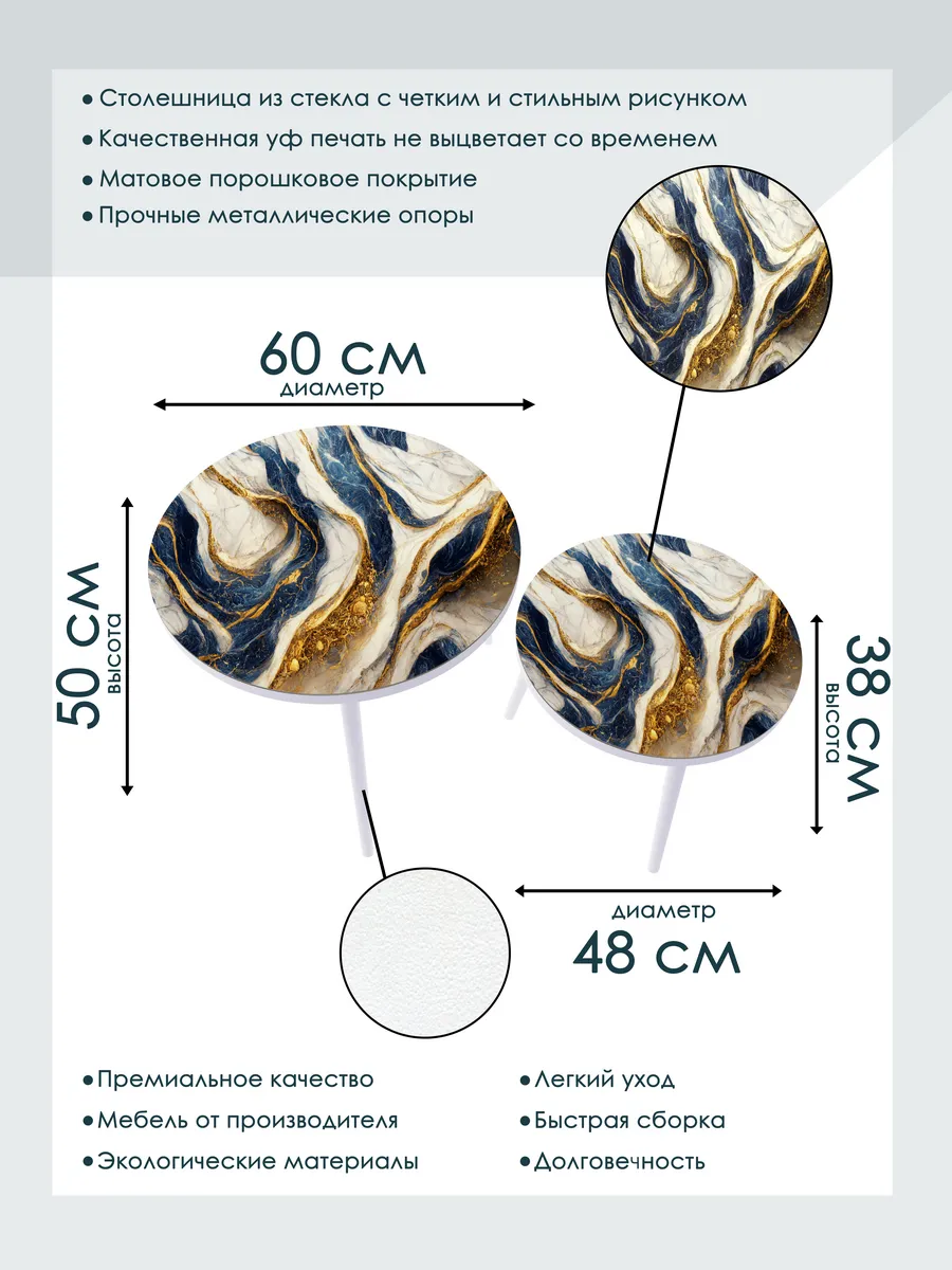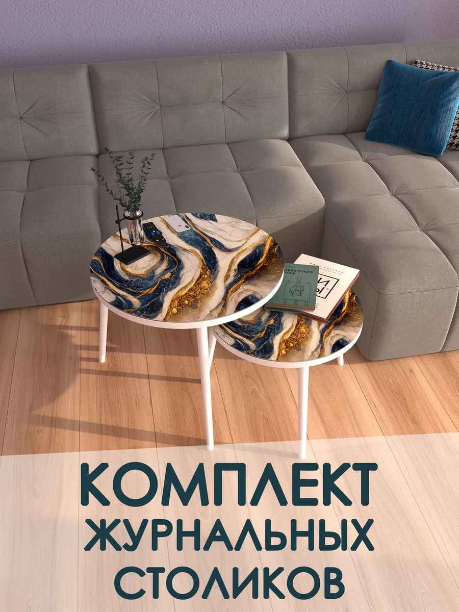Представляем вам элегантную пару журнальных столиков, созданных для тех, кто ценит стиль и функциональность. Эти столики отличаются изысканным сочетанием белого цвета ножек и столешниц цвета «Синее Золото», что придаёт интерьеру особый шарм и лёгкость.