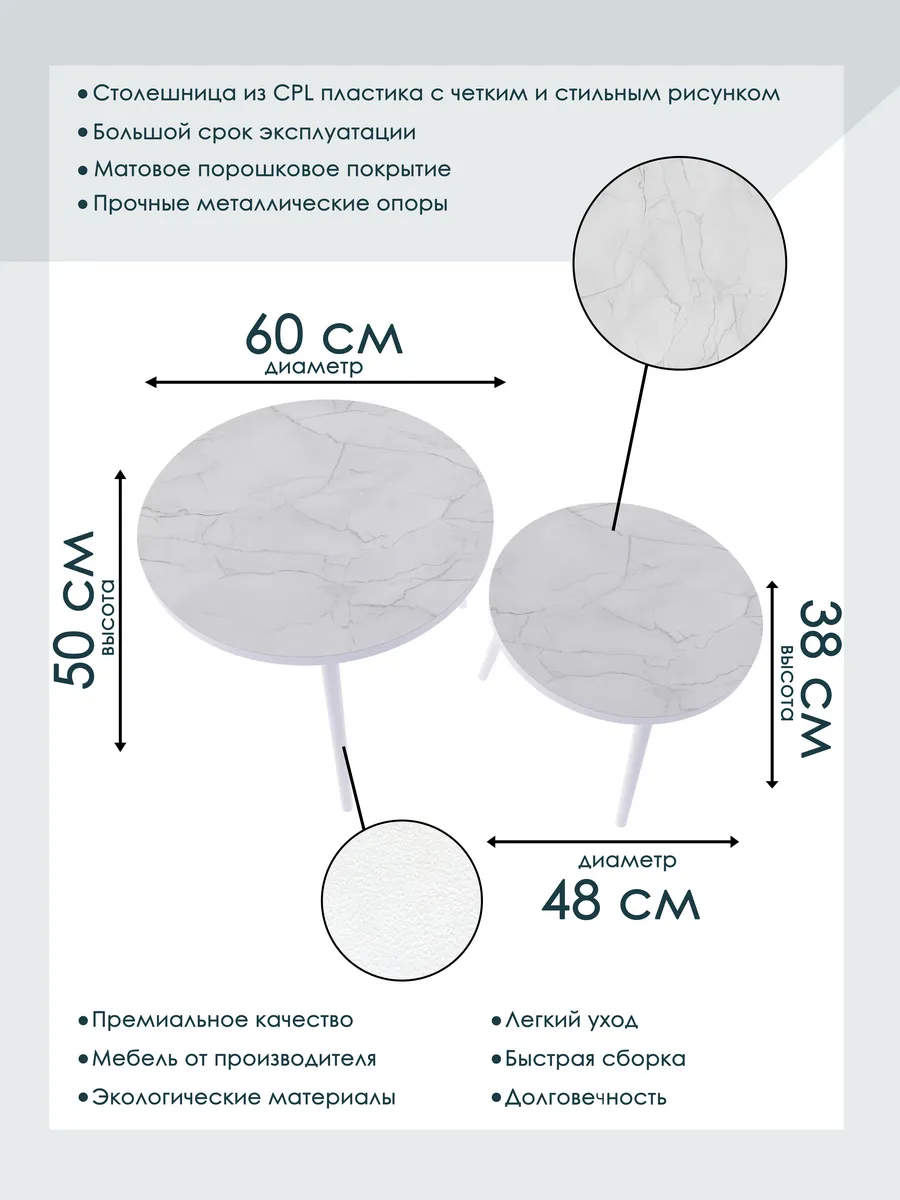 Высота первого столика составляет 37 см, а диаметр — 48 см. Второй столик чуть выше — 44 см, а его диаметр равен 60 см. Вместе они образуют гармоничную композицию, которая станет прекрасным дополнением к любому интерьеру. Оба столика выполнены из качественных материалов, обеспечивающих долговечность и надёжность.